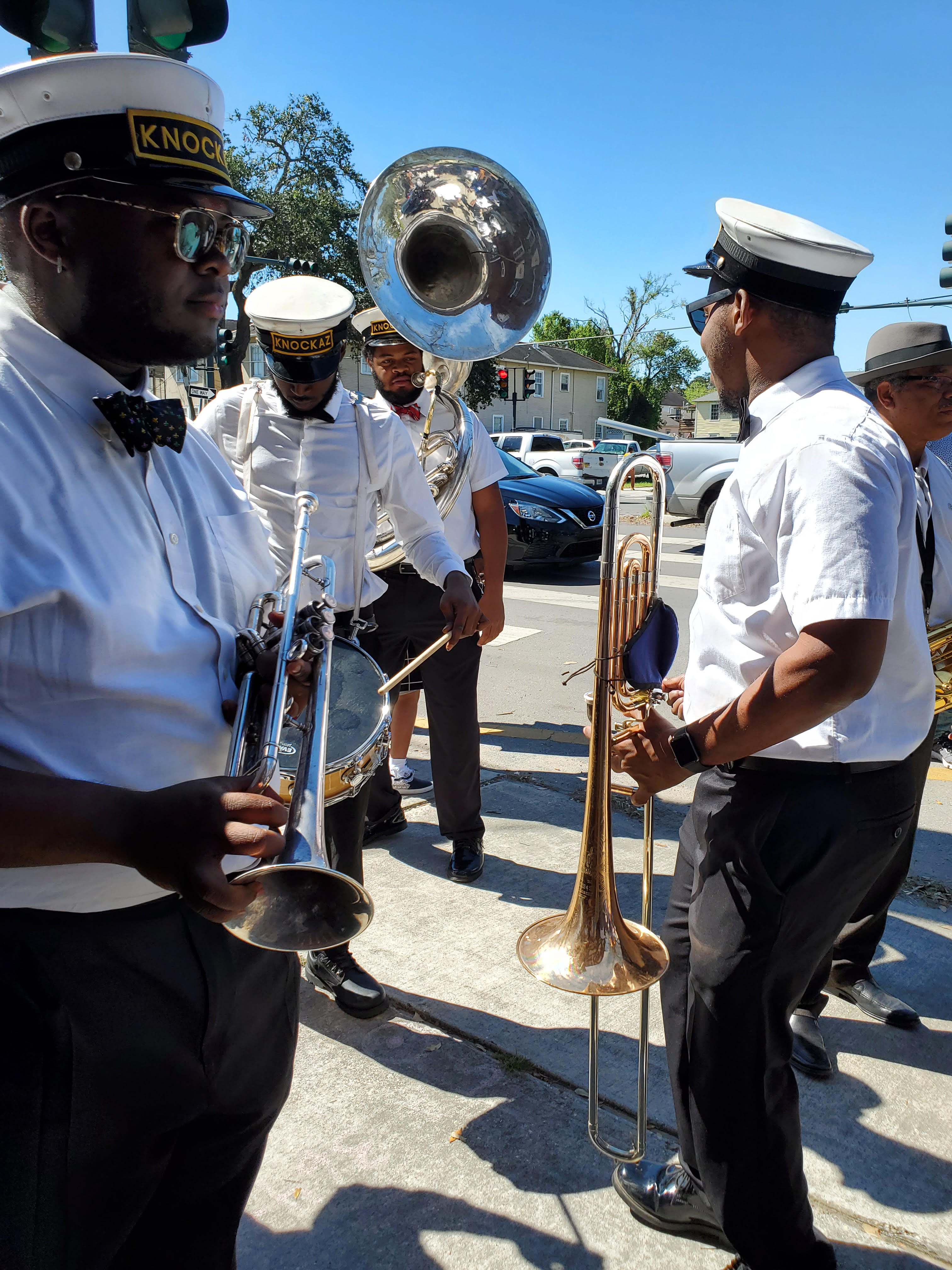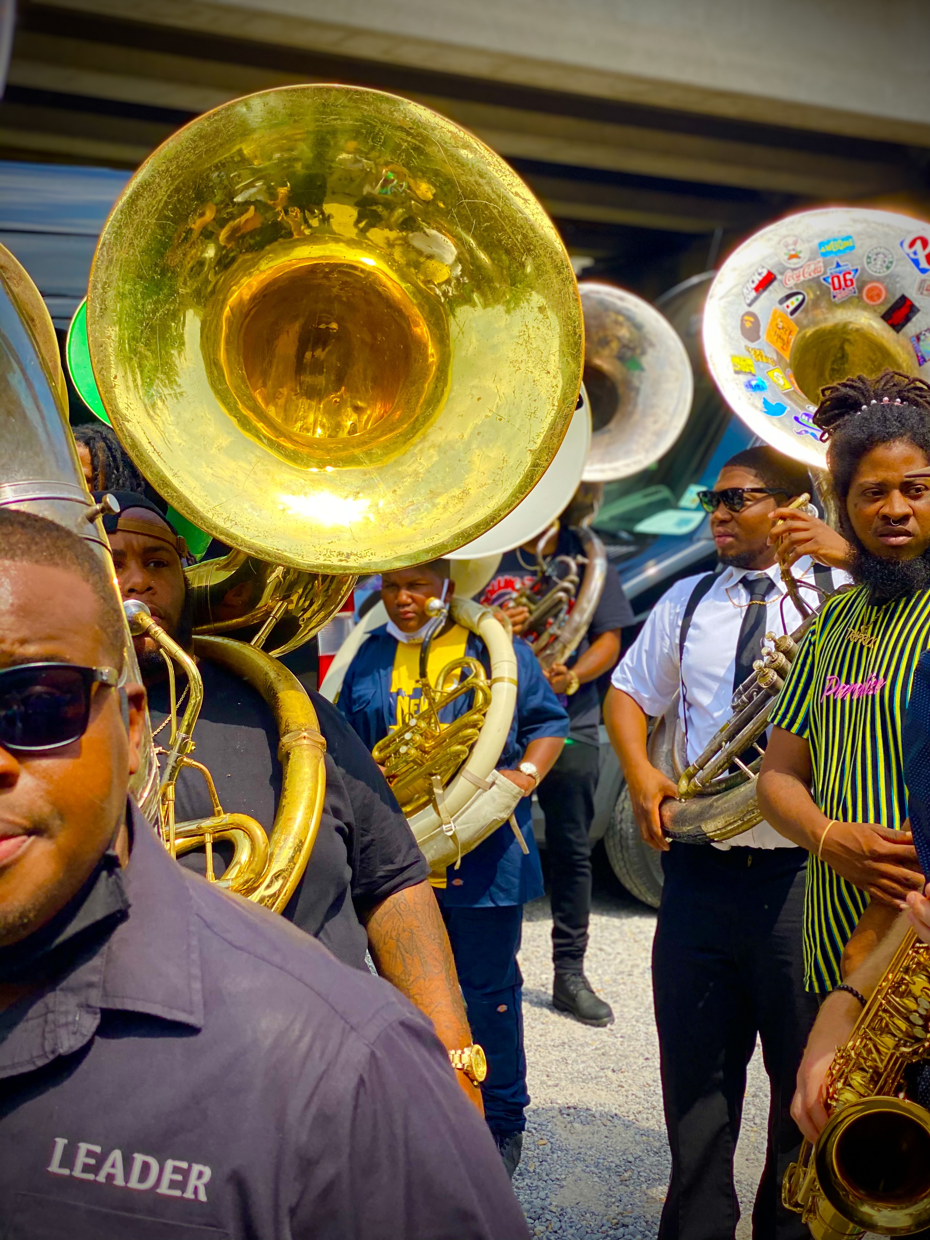 A typical funeral begins with a slow march while the coffin is carried by a horse-drawn hearse, accompanied by a brass band playing somber dirges and hymns. After the memorial service, people on the streets, along with dapper dancers from Social Aid & Pleasure clubs, join the mourners to the cemetery. This group is referred to as the “Second-Line.” The brass band plays with a swing beat to alert mourners that the mood is about to change, then they launch into “When the Saints Come Marching In” to joyfully raise the soul to heaven!