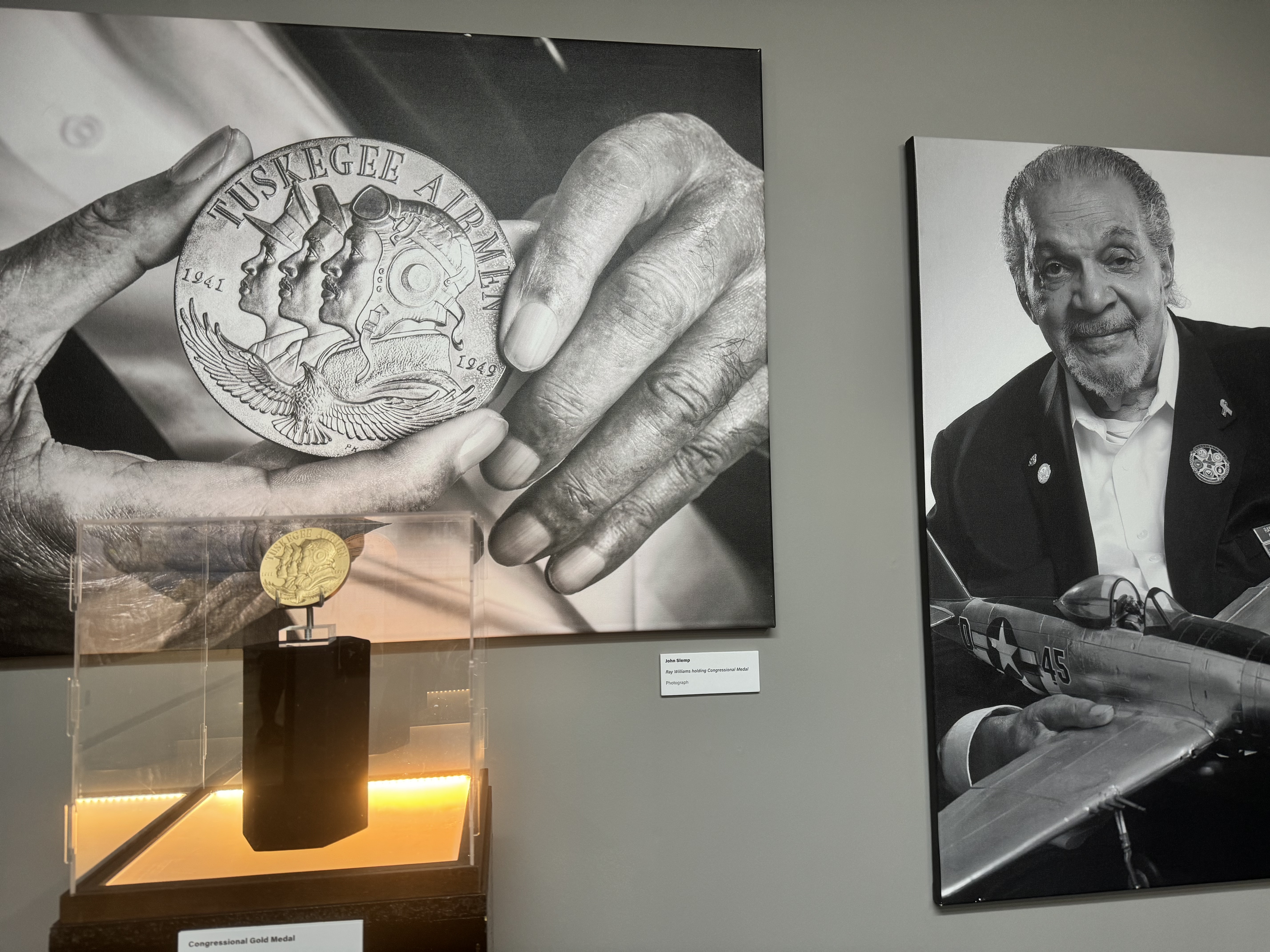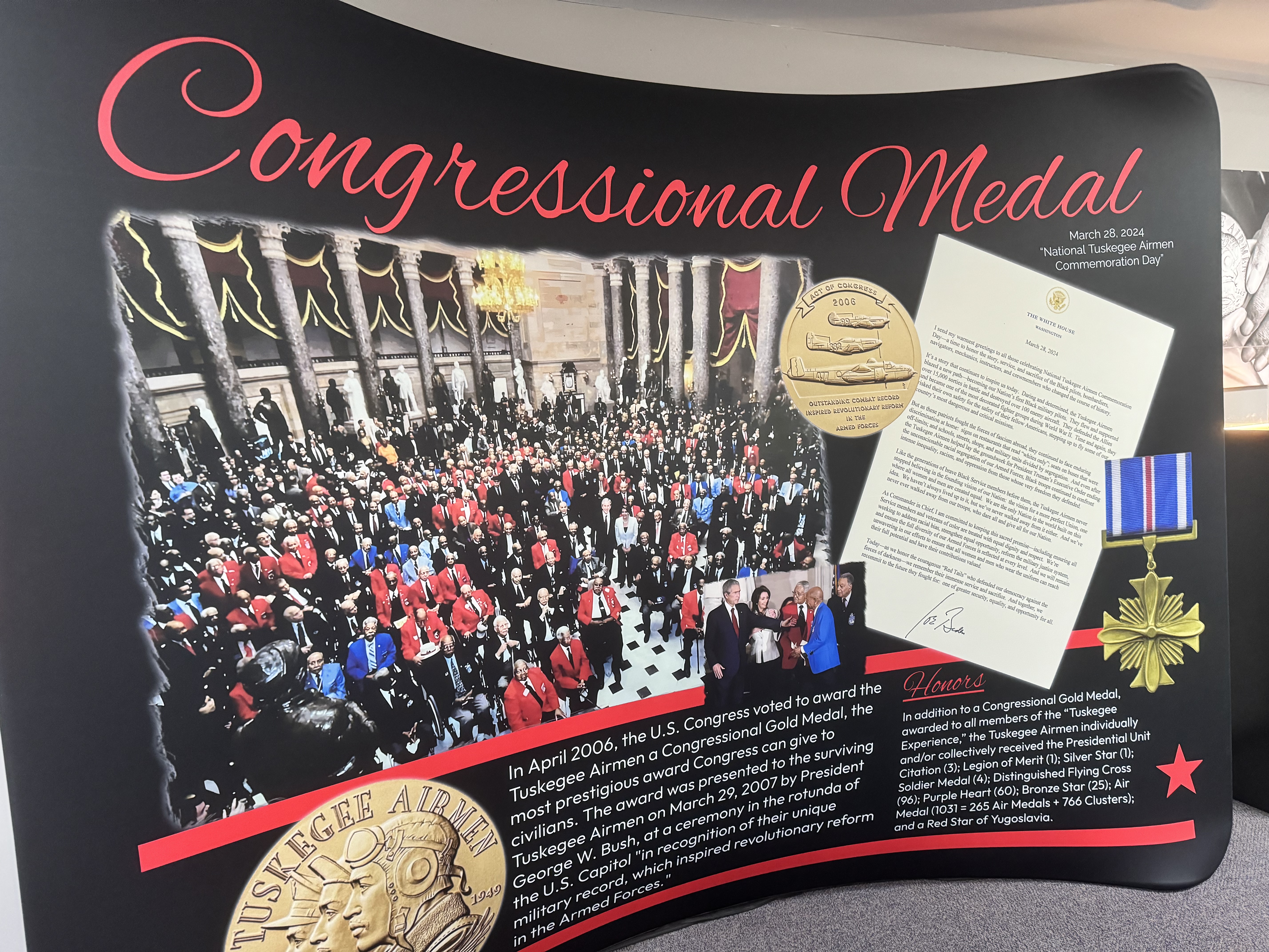 Among the content, a rare article heralding Charles B. Hall, the first Black pilot to shoot down the enemy in WWII, a print signed by General Benjamin O. Davis, Congressional Gold Medals awarded to the Airmen by President George W. Bush in 2007, and a large-scale model of a P-51 fighter “Red Tail” plane signed by several of the original pilots.